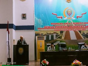 Dobo-Diskominfo.Bupati Kepulauan Aru Timotius Kaidel menghadiri Rapat Paripurna Dewan Perwakilan Rakyat Daerah (DPRD) Kabupaten Kepulauan Aru dalam rangka penyampaian nota pengantar Kebijakan Umum Anggaran dan Prioritas Plafon Anggaran Sementara (KUA/PPAS) Perubahan tahun anggaran 2025.sidang berlangsung di ruang sidang sementara gedung Sita Kena Dobo, Selasa (23/9/2025).