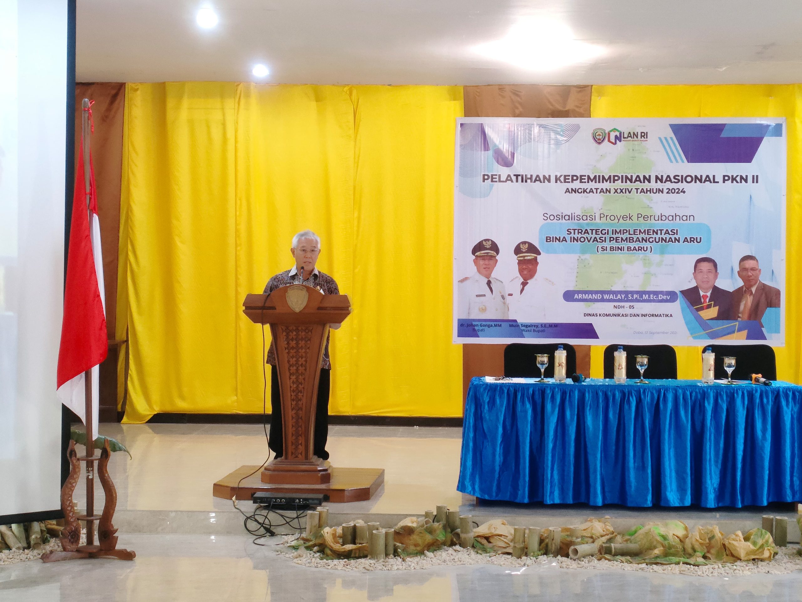 Dobo-Diskominfo. Acara sosialisasi strategi implementasi bina inovasi pembangunan aru (SIBINI BARU) yang disampaikan oleh Kepala Dinas Komunikasi dan Informatika yang juga PLT Kepala Dinas Kelautan dan Perikanan Armand Walay S.Pi, M.Ec.Dev sebagai Reformer proyek perubahan Pelatihan Kepemimpinan Nasional II angkatan ke XXIV tahun 2024 berlangsung di lantai II Gedung BPKAD Jumat (13/09/2024).